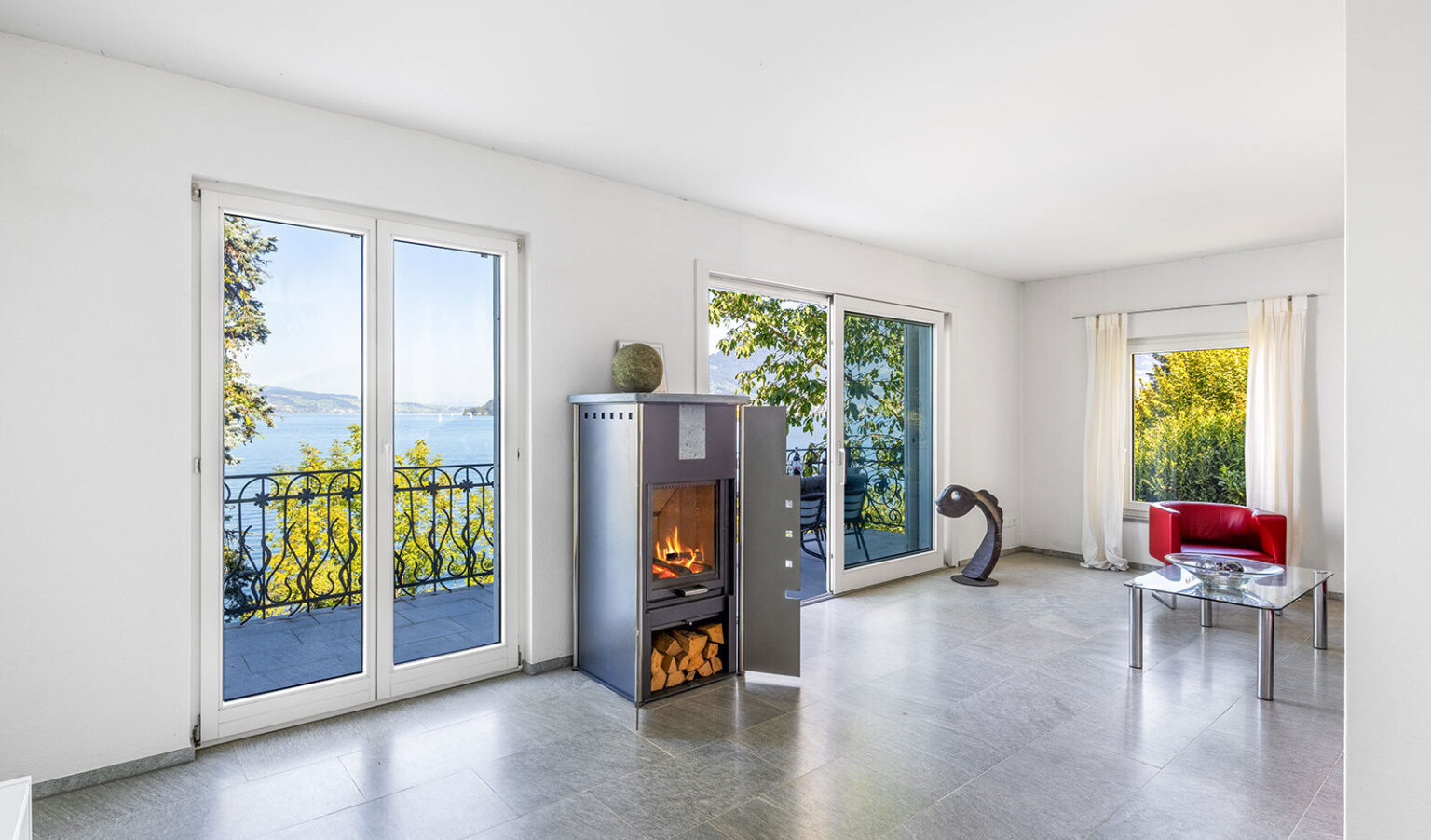 Im Wohnbereich mit grossen Fensterfronten geniessen Sie auch in der Winterzeit bei knisterndem Feuer im Schwedenofen eine herrliche Aussicht und gemütliche Stunden.