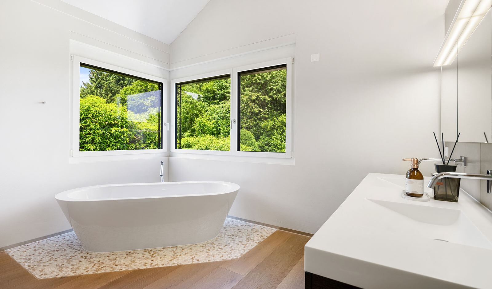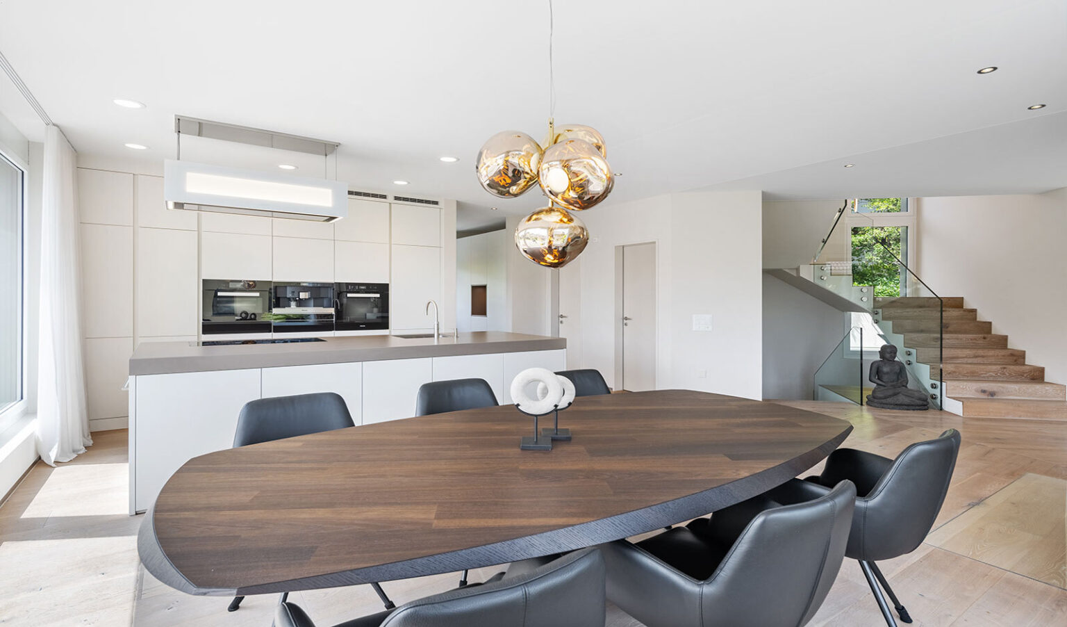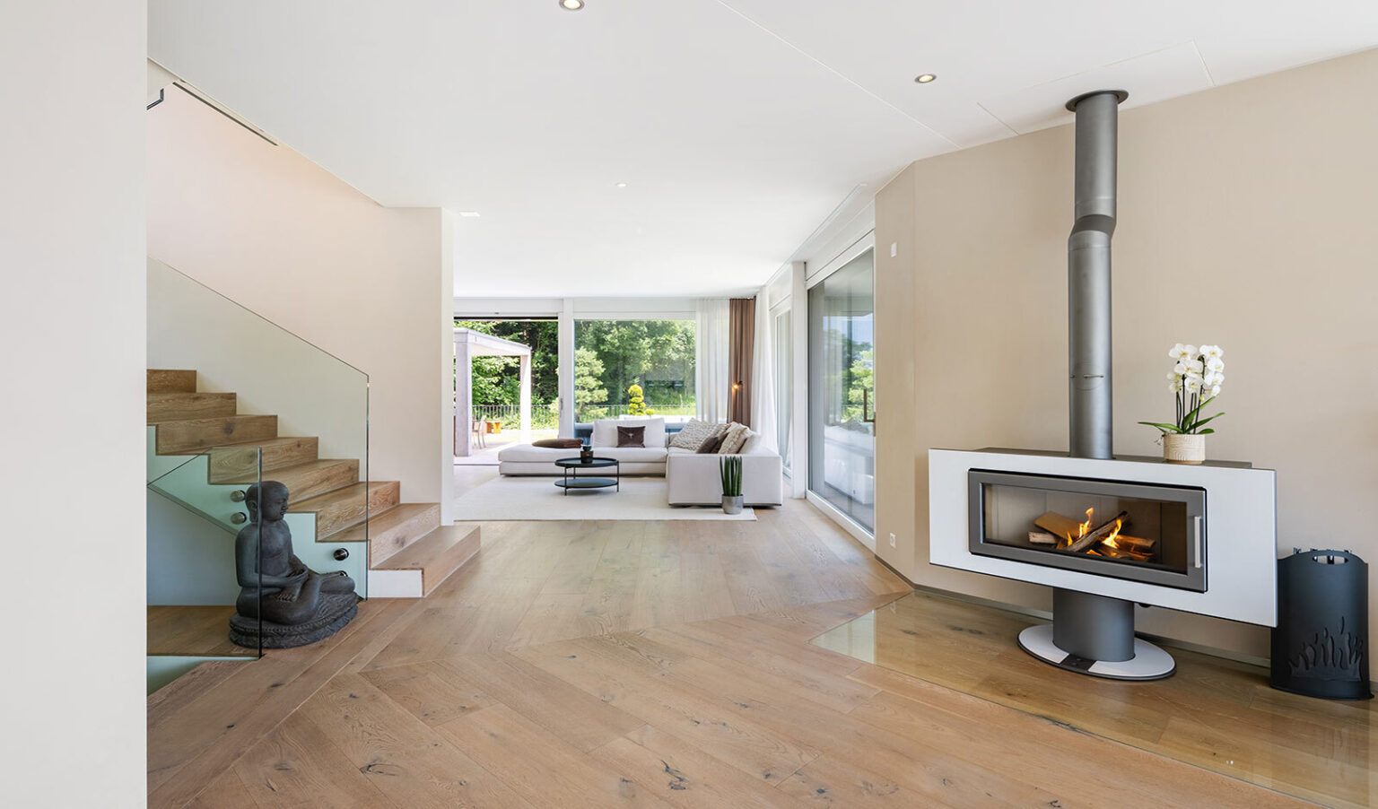 Die grossen Glasfronten öffnen die Räume zur Natur und lassen viel Licht ins Innere. Weiss geölter Massivparkett, warme Erd- und Naturtöne und Raumhöhen bis 2.70 Meter prägen das elegante Wohnambiente. Die hochwertig ausgestattete Küche mit Quooker, Steamer, Weinkühlschrank, höhenverstellbarem Dunstabzug und extragrossem Induktionsfeld bildet das Zentrum des Anwesens. Der Masterbereich überzeugt mit begehbarer Ankleide und luxuriösem Bad en Suite mit freistehender Badewanne, Regendusche in Naturstein, Dusch-WC und edlen Armaturen. Die Schlafzimmer verfügen über massgefertigte Einbauschränke und Insektenschutzgitter an allen Fenstern.