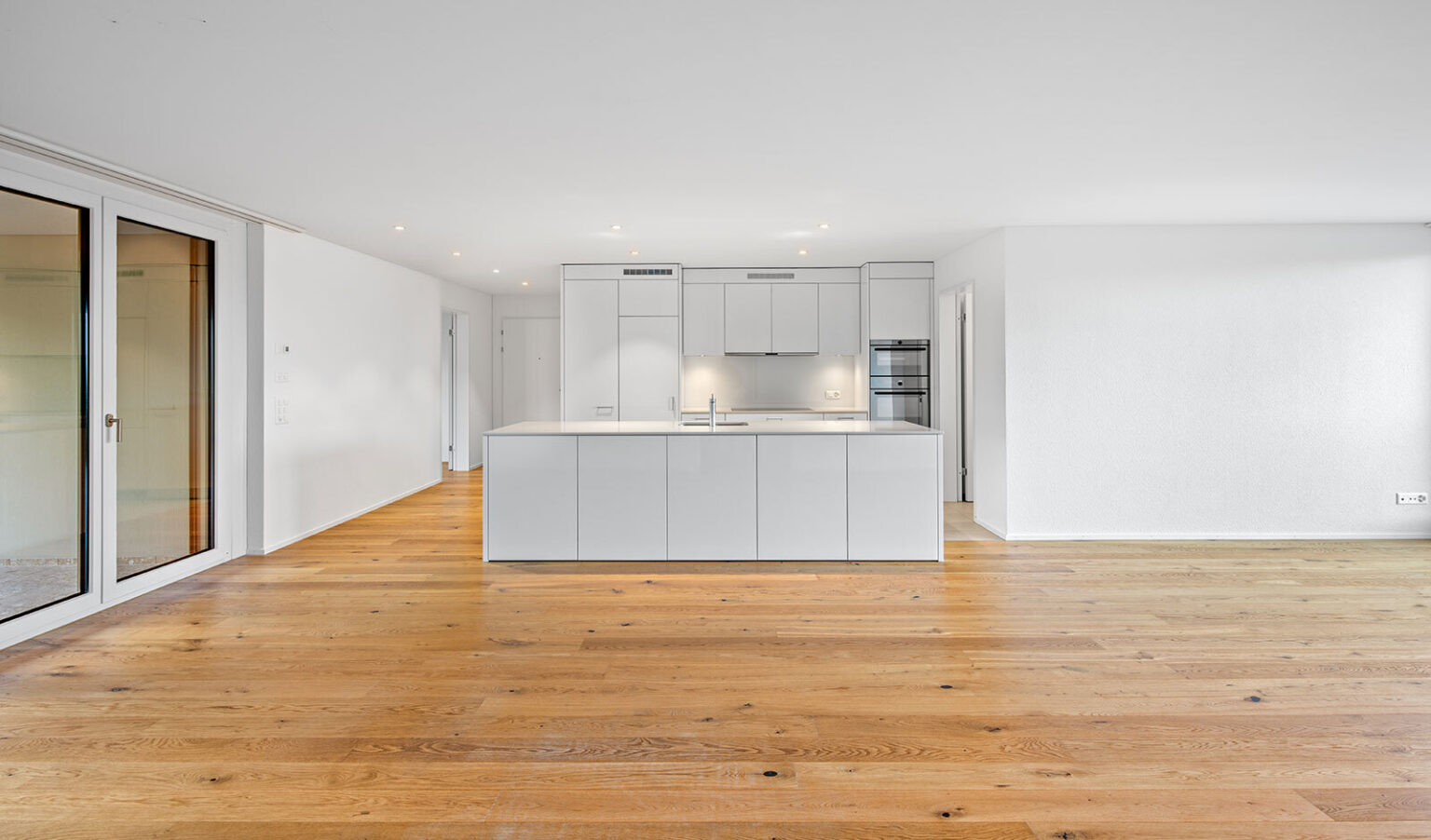 Beim Eintritt in die 4.5-Zimmer-Wohnung empfängt Sie eine elegante Garderobe, dezent inszeniert durch LED-Spots. Der offene Wohn-, Ess- und Kochbereich überzeugt mit grosszügiger Raumwirkung, einer edlen Arbeitsinsel in zeitlosem Weiss und hochwertigem Eichenparkett. Die Geräte von V-Zug – Induktionskochfeld, Backofen, Steamer und Geschirrspüler – erfüllen höchste Ansprüche; ein praktisches Reduit sorgt für willkommene Ordnung.