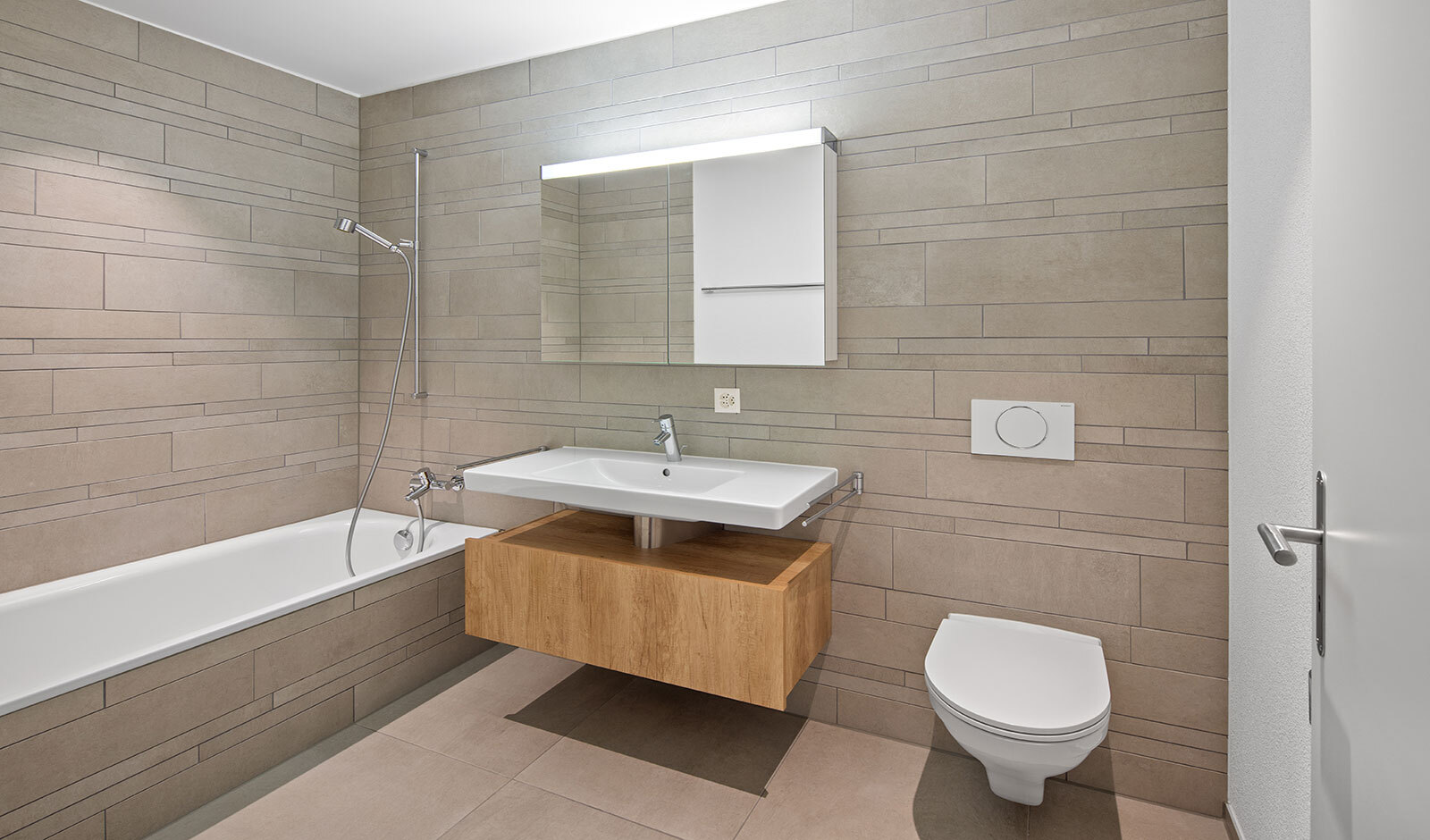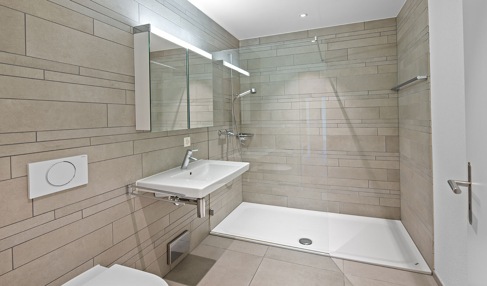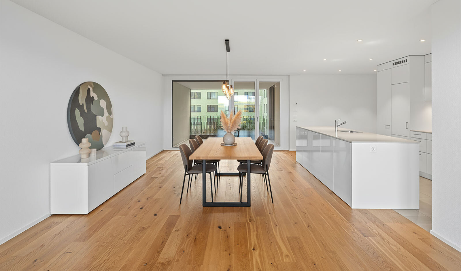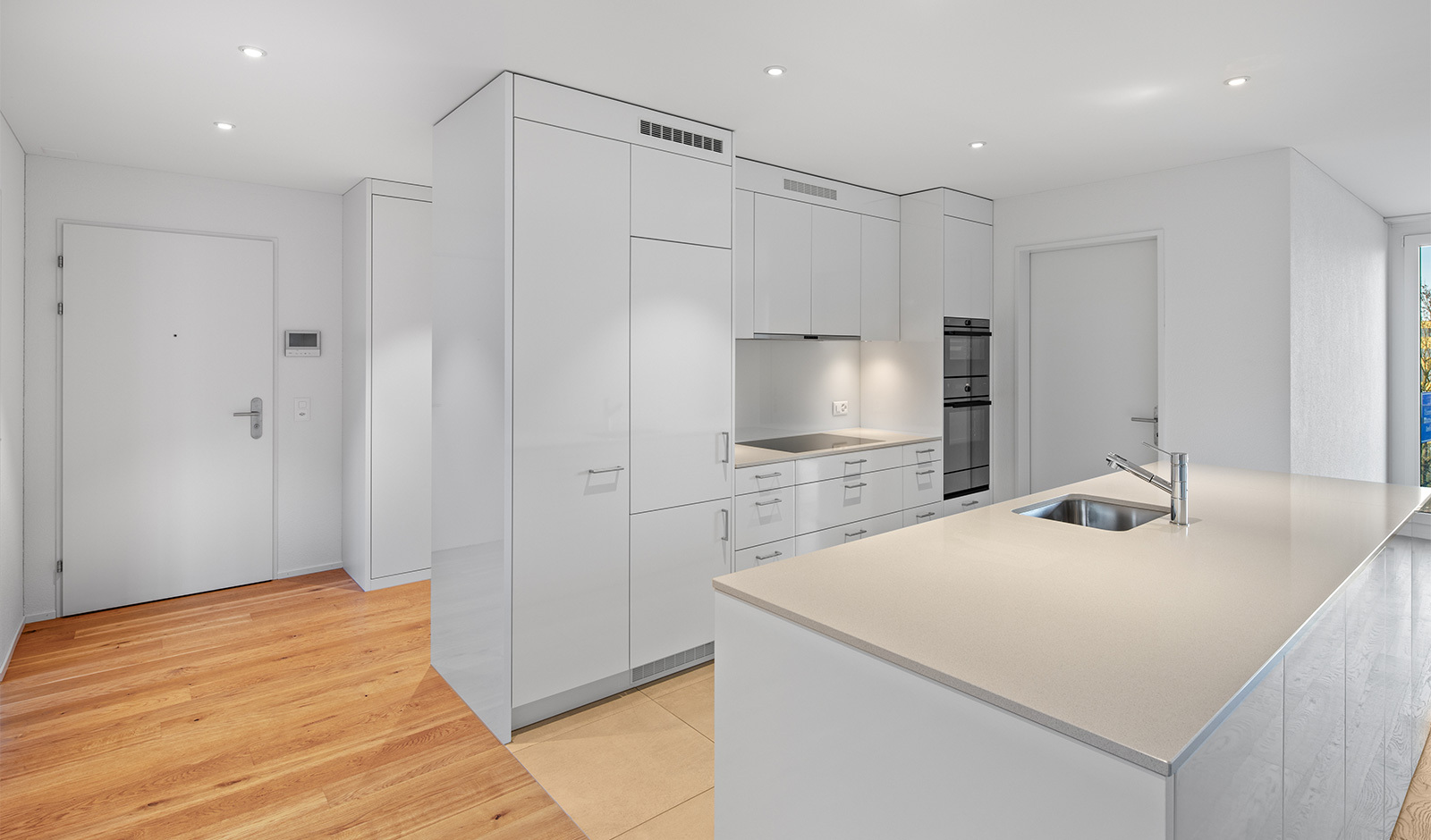 Beim Eintritt in die 4.5-Zimmer-Wohnung empfängt Sie eine elegante Garderobe, dezent inszeniert durch LED-Spots. Der offene Wohn-, Ess- und Kochbereich überzeugt mit grosszügiger Raumwirkung, einer edlen Arbeitsinsel in zeitlosem Weiss und hochwertigem Eichenparkett. Die Geräte von V-Zug – Induktionskochfeld, Backofen, Steamer und Geschirrspüler – erfüllen höchste Ansprüche; ein praktisches Reduit sorgt für willkommene Ordnung.