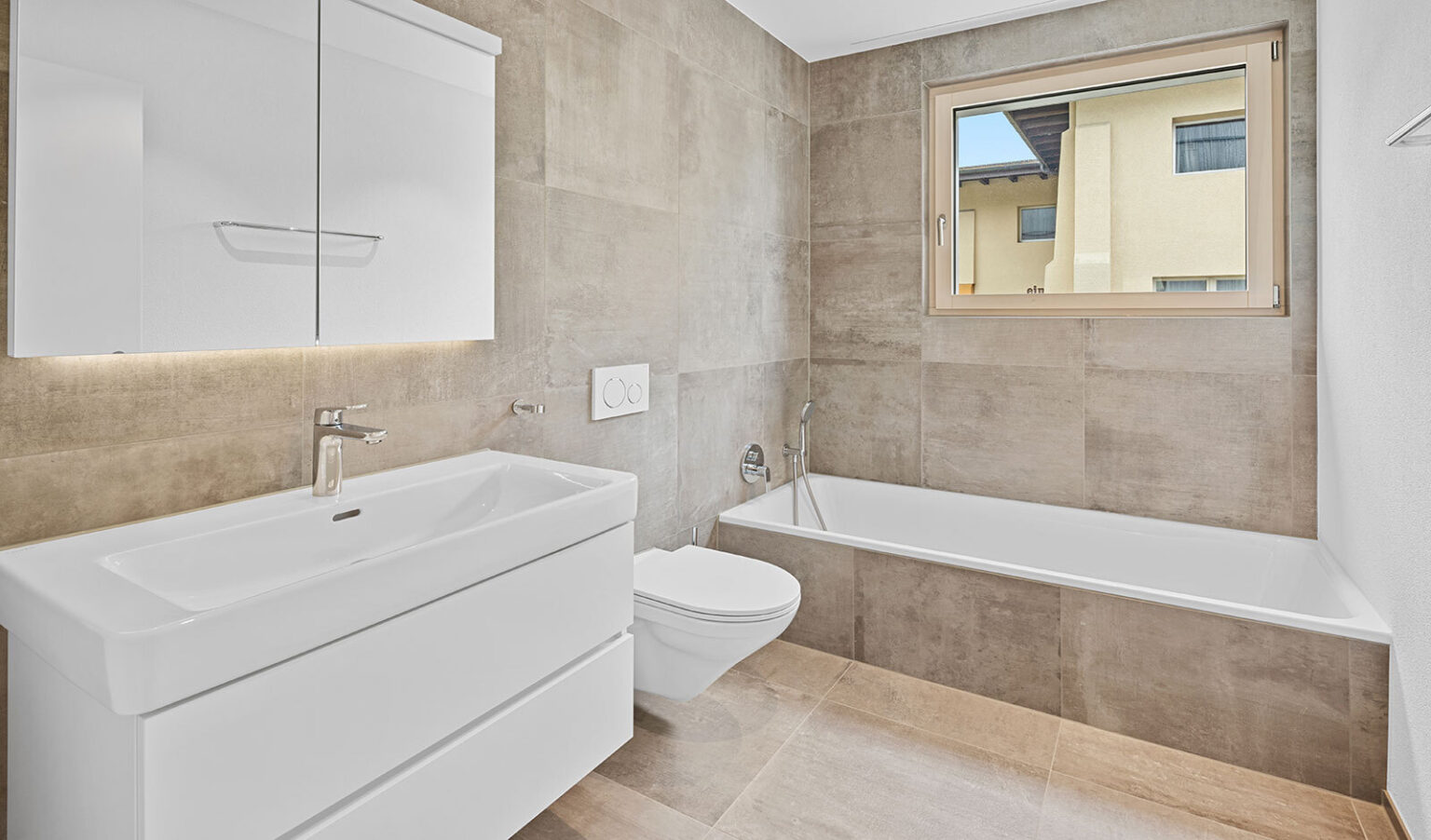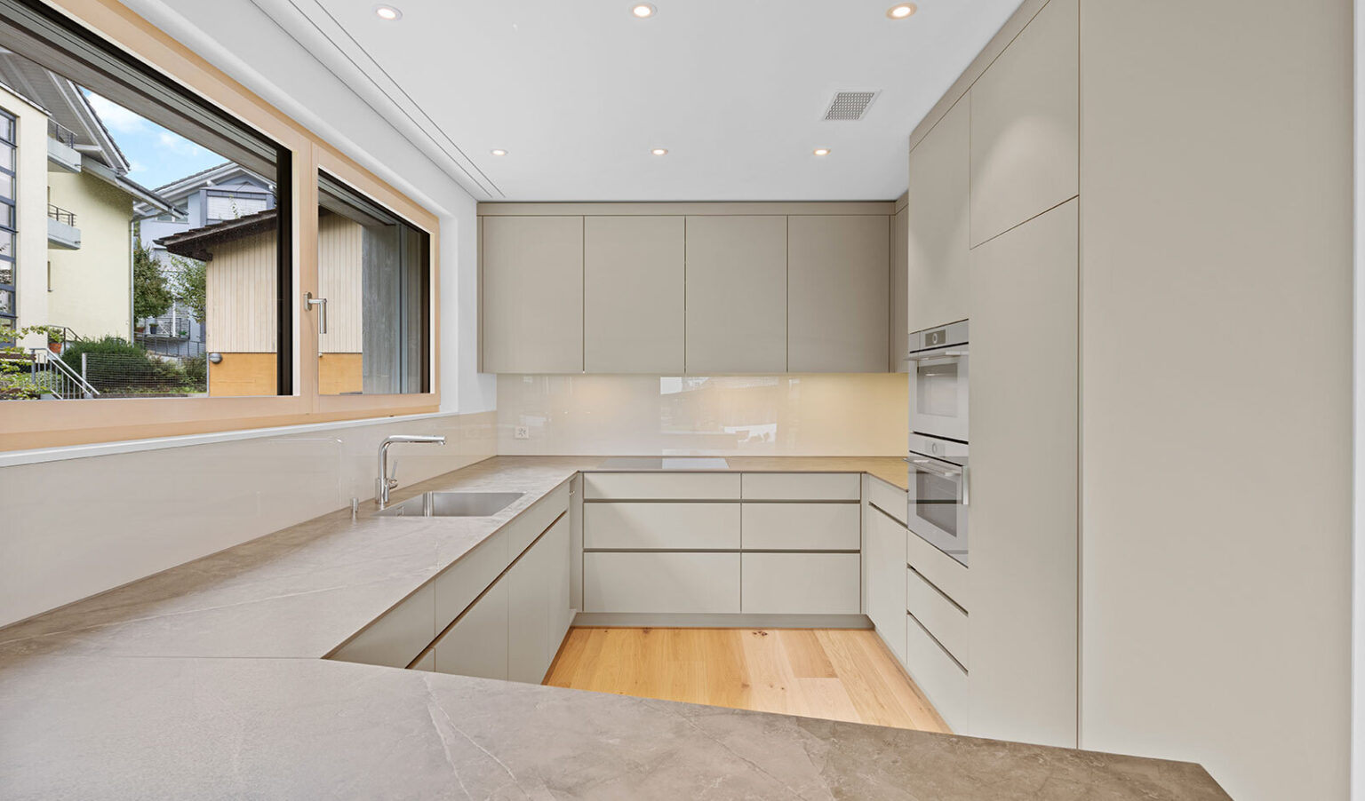 Das Domizil zeichnet sich durch ausgesuchte Materialien und sorgfältige Verarbeitung aus: Fussbodenheizung, kontrollierte Lüftung, integrierte Spot-Beleuchtung und massgefertigte Einbauschränke schaffen hohen Komfort. Durchgehender Eiche-Parkettboden und stilvolle Badezimmer mit Natursteinoberflächen verleihen jedem Raum Wärme und Eleganz. Hochwertige Geräten von V-Zug unterstreichen den Qualitätsanspruch der modernen Küche in edlem Erdton.