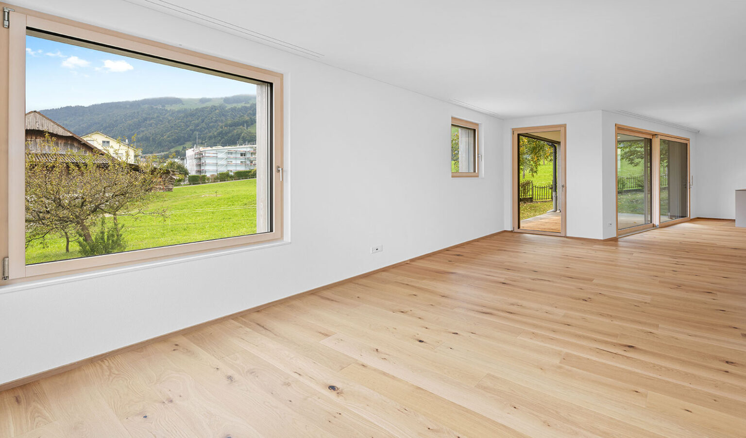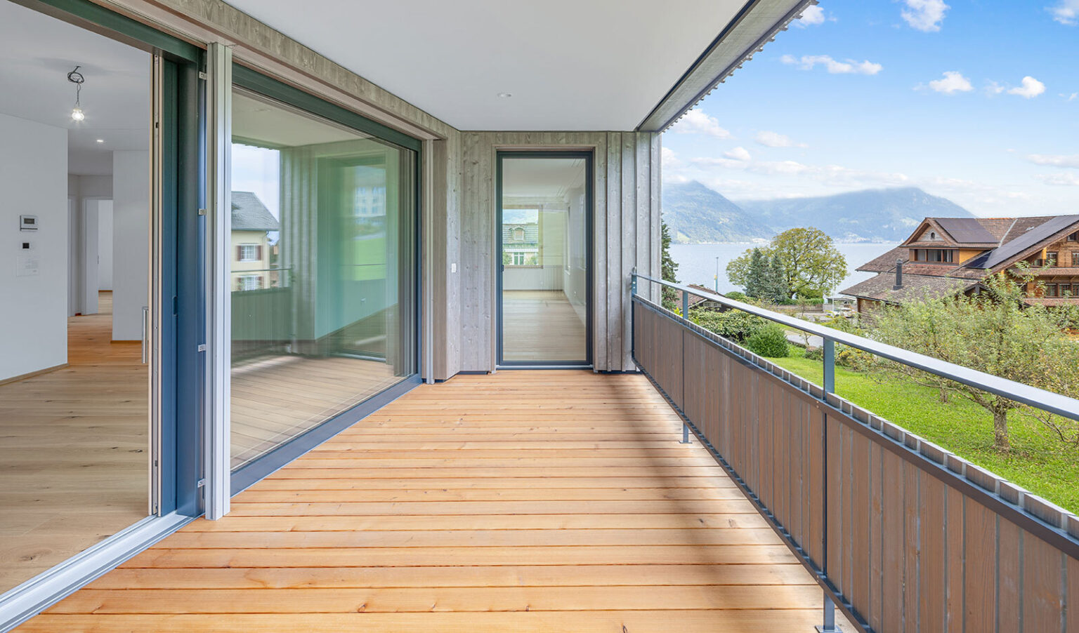 Die Liegenschaft präsentiert sich mit einem eindrucksvollen Ausblick auf den See und die Berge. Auf der grosszügigen Loggia kann man an lauen Sommerabenden entspannen, frische Luft geniessen und den Blick auf die malerische Umgebung schweifen lassen. Nach dem Abendrot funkeln die ersten Sterne, während eine sanfte Brise weht und die Umgebung nach Wiesenkräutern duftet. Innen- und Aussenräume verschmelzen zu einer abwechslungsreichen Wohnlandschaft, die Wohnen und Erholung elegant vereint.