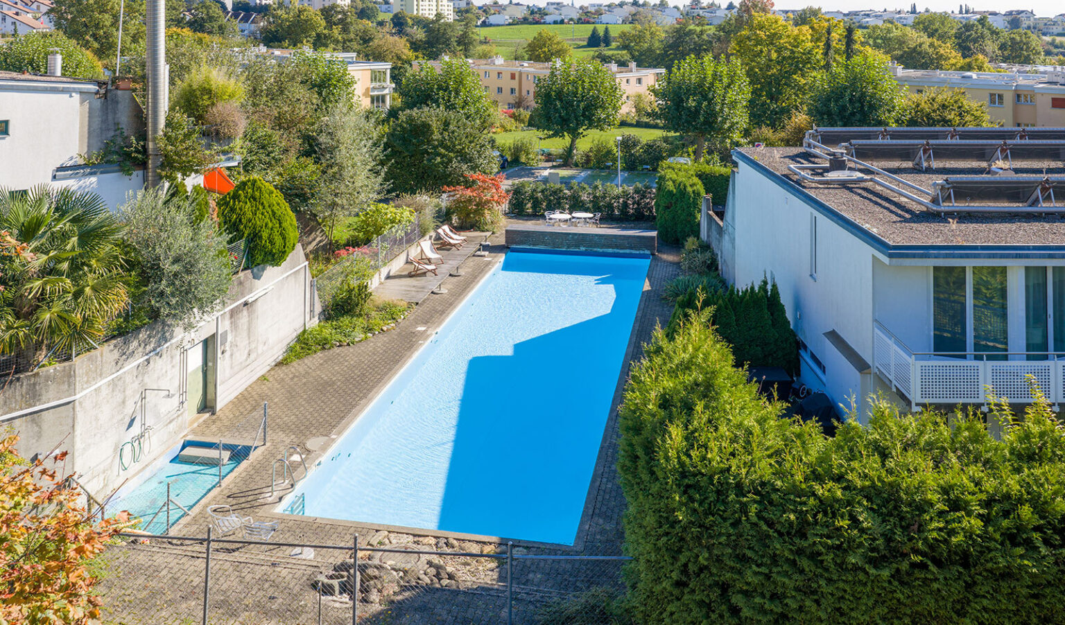 Das autofreie Quartier bietet eine besondere Wohnqualität: Die weitläufigen Gemeinschaftsflächen stehen allen Bewohnern offen – darunter Spielwiesen, ein grosser beheizter Swimmingpool (6 x 20 m), Tischtennisanlagen und eine Feuerstelle. Eine lebendige Nachbarschaft mit viel Zusammenhalt macht das Quartier zu einem idealen Umfeld für Familien.