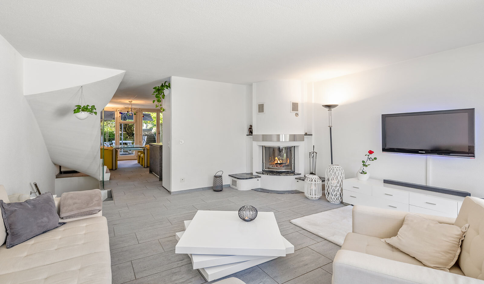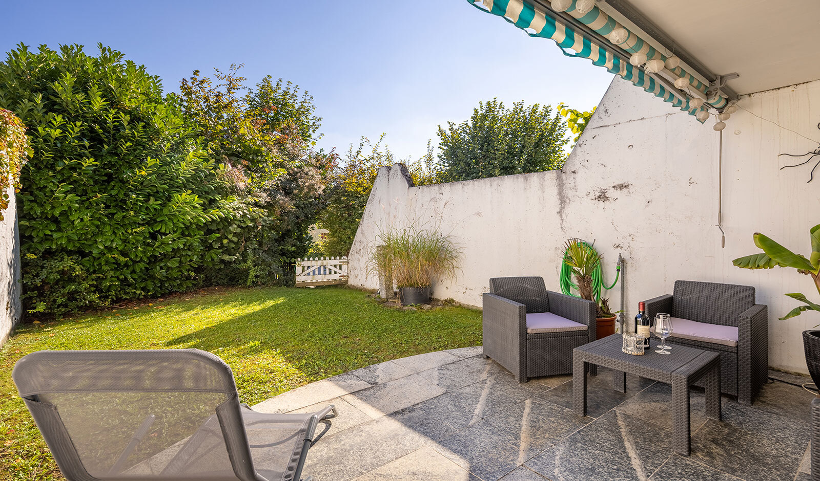 Ein schöner Aussenbereich mit Rasenfläche und Naturhecke schliesst an das Wohnzimmer an. Auf der Eingangsseite lädt ein Sitzplatz unter einem grossen Blätterdach zum Verweilen im Schatten ein. Im Untergeschoss stehen neben Hauswirtschafts- und Kellerräumen auch ein beheizter Hobbyraum mit Tageslicht zur Verfügung.
