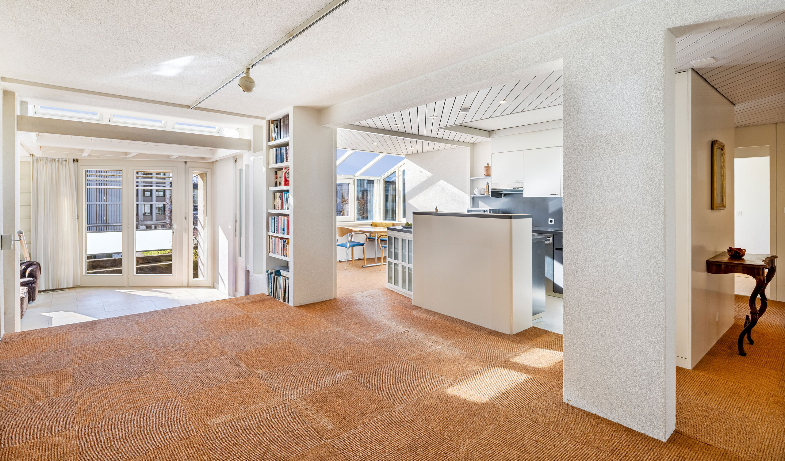 Die 5.5-Zimmer-Eigentumswohnung befindet sich im 1. Obergeschoss. Eine interessante Raumaufteilung lässt viele Gestaltungsmöglichkeiten offen. So lassen sich die Zimmer nach Ihren Vorstellungen einrichten oder zusammenfügen. Die Wohnung verfügt über zwei Badezimmer mit Duschen. Der Wohn- und Essbereich mit Cheminée und der Wintergarten laden zum Verweilen ein.
