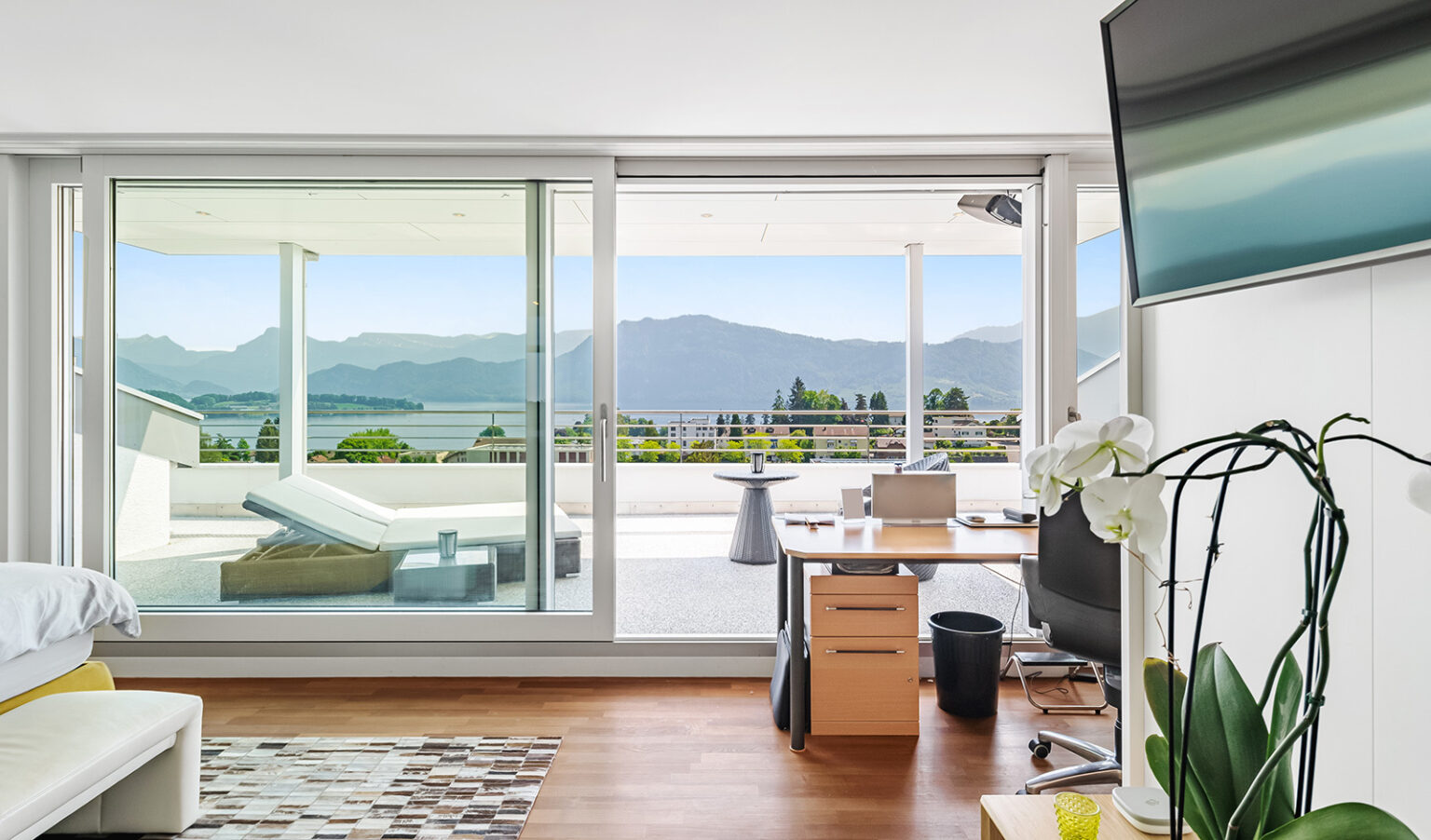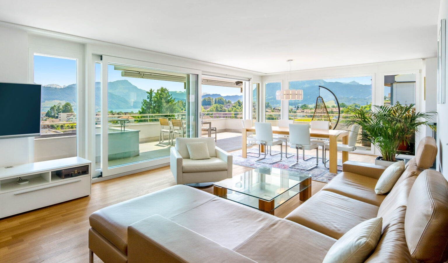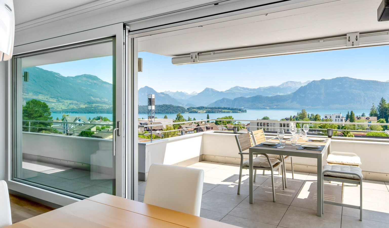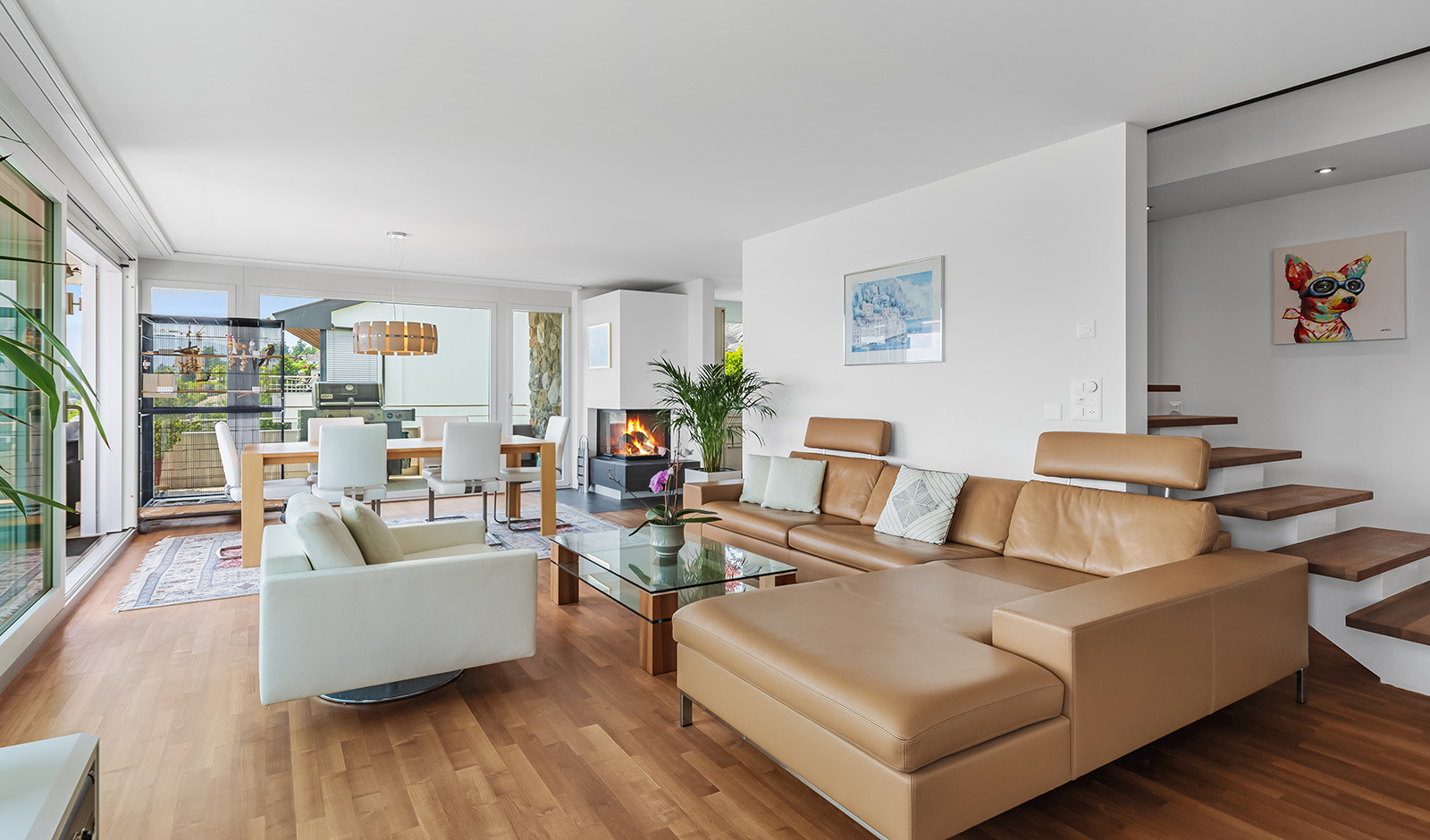 Beim Betreten der Wohnung fällt der dunkle Akazienparkett ins Auge, dessen kräftige, edle Farbe eine ansprechende Atmosphäre schafft. Ein weiteres stilvolles Element ist die offene Treppe ins Obergeschoss. Der offene Wohn-/Essbereich wird von einer traumhaften Aussicht bereichert. Die angrenzende Terrasse wird schnell zu Ihrem Lieblingsplatz, wo Sie die Sonne geniessen und nach einem langen Arbeitstag entspannen können. Der Blick reicht über den glitzernden See bis hin zum imposanten Bergpanorama. Dies ist wahrer Luxus und bietet der ganzen Familie pure Lebensqualität.
