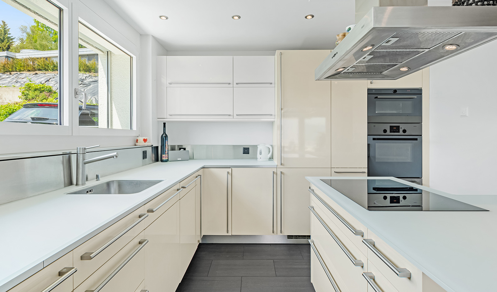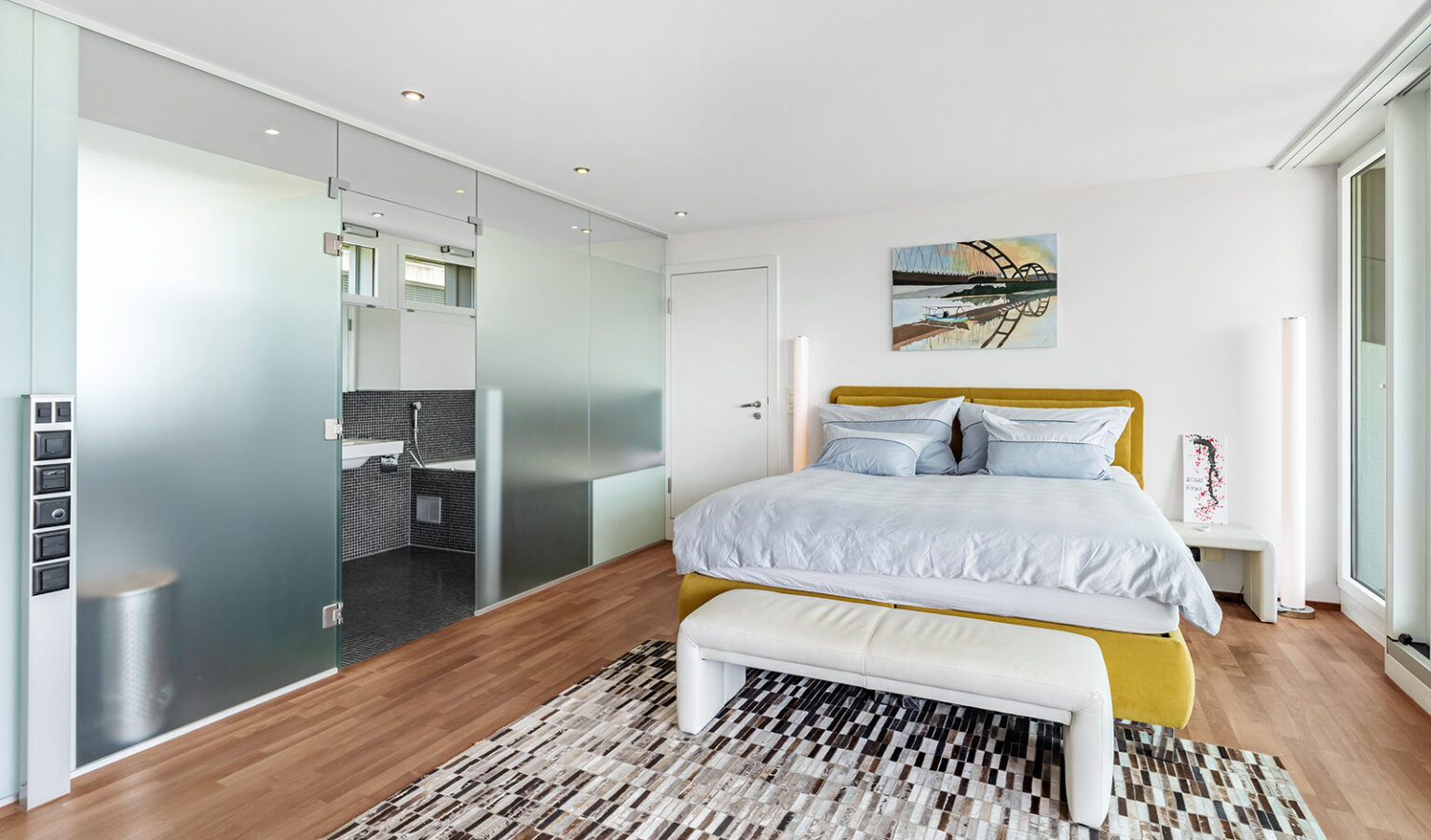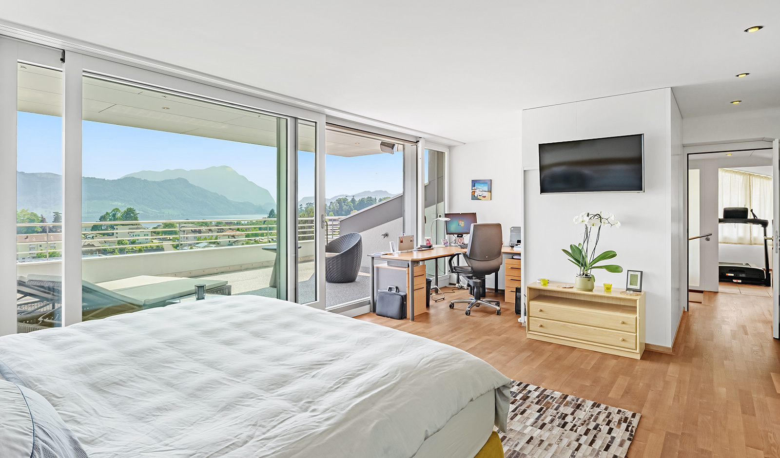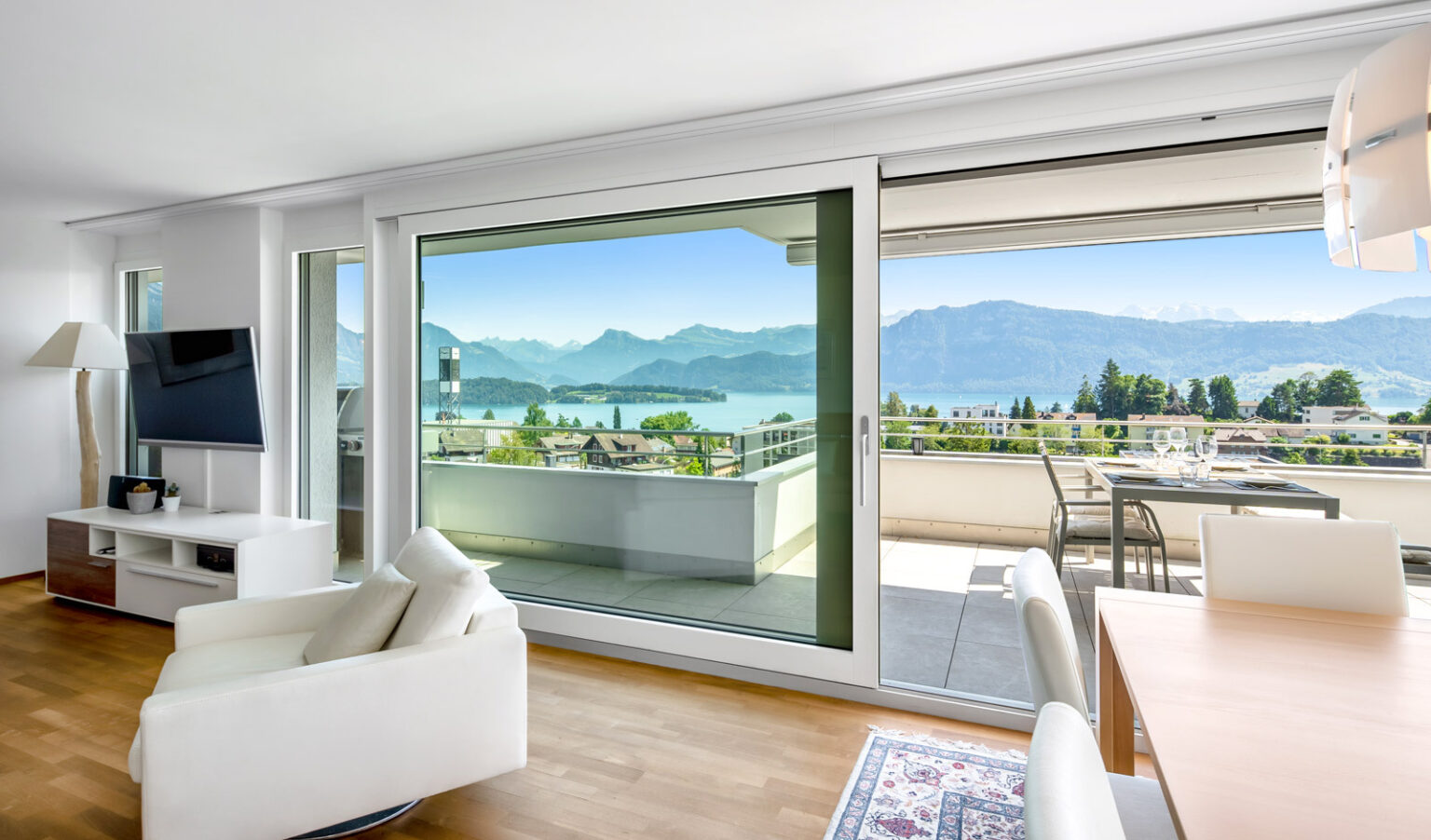 Beim Betreten der Wohnung fällt der dunkle Akazienparkett ins Auge, dessen kräftige, edle Farbe eine ansprechende Atmosphäre schafft. Ein weiteres stilvolles Element ist die offene Treppe ins Obergeschoss. Der offene Wohn-/Essbereich wird von einer traumhaften Aussicht bereichert. Die angrenzende Terrasse wird schnell zu Ihrem Lieblingsplatz, wo Sie die Sonne geniessen und nach einem langen Arbeitstag entspannen können. Der Blick reicht über den glitzernden See bis hin zum imposanten Bergpanorama. Dies ist wahrer Luxus und bietet der ganzen Familie pure Lebensqualität.
