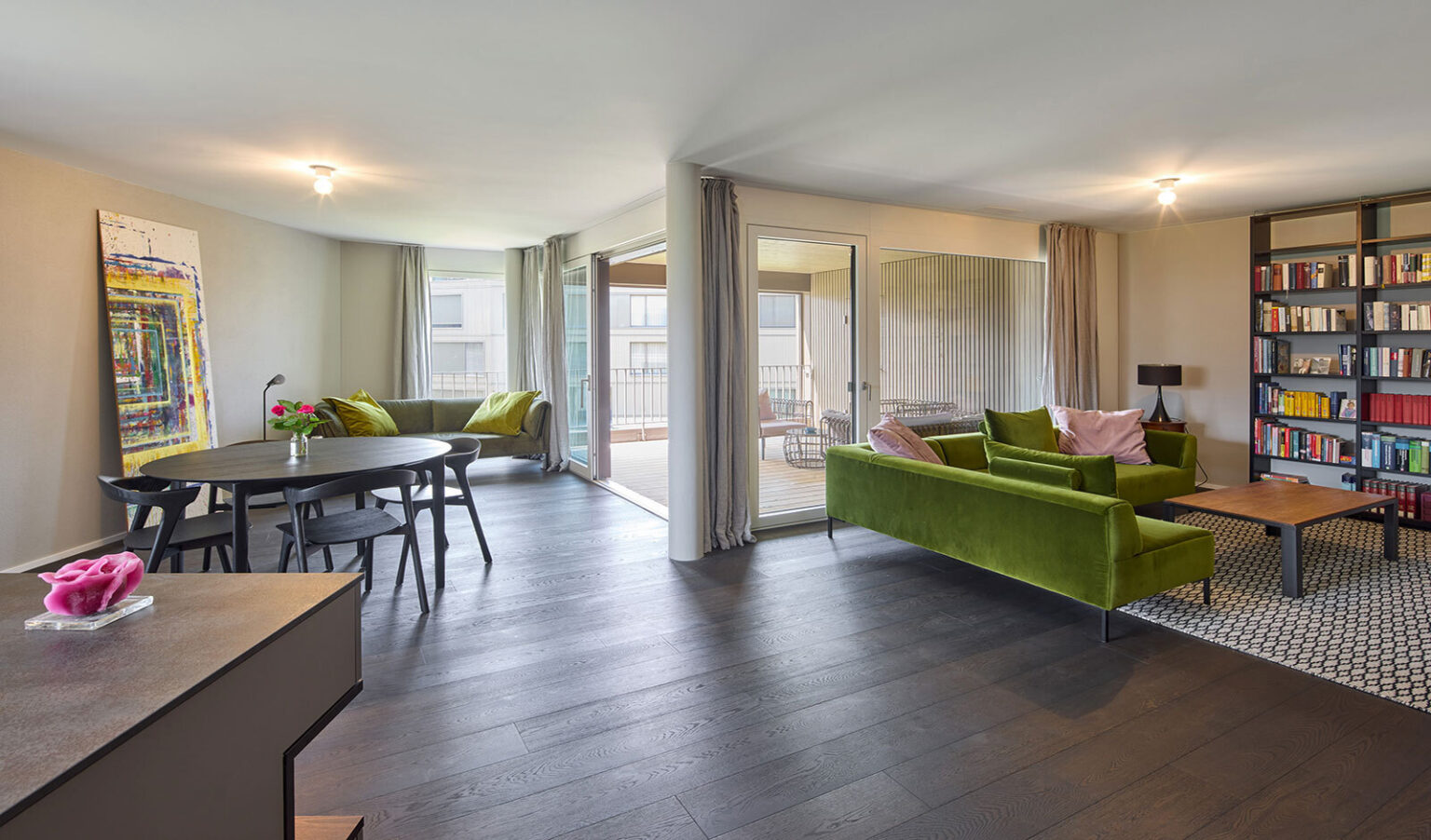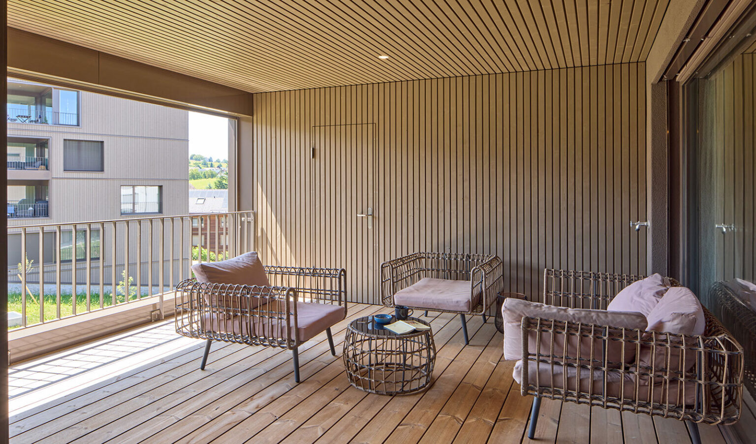 Die geschützte Loggia bietet eine private Rückzugsoase im Freien und gewährt einen schönen Blick in die sorgfältig gestaltete Umgebung.
